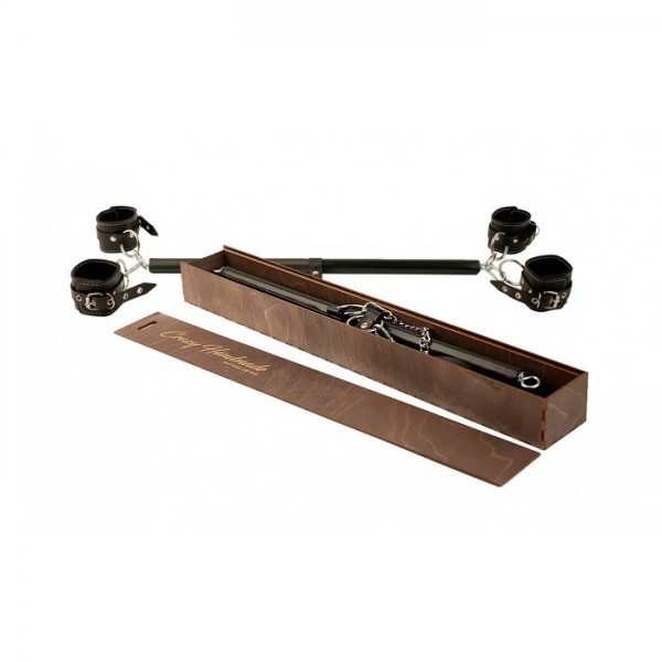 Распорка выполнена из дерева и обтянута натуральной кожей. По краям металлические кольца, к которым крепятся оковы. Посередине распорки находятся широкие металлические кольца, к которым присоединяются наручники